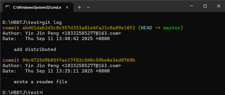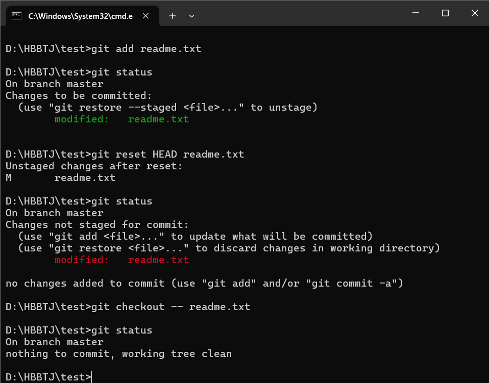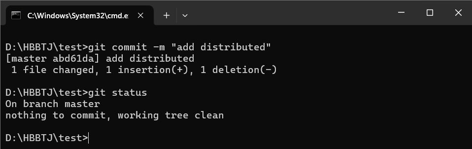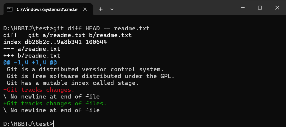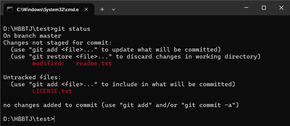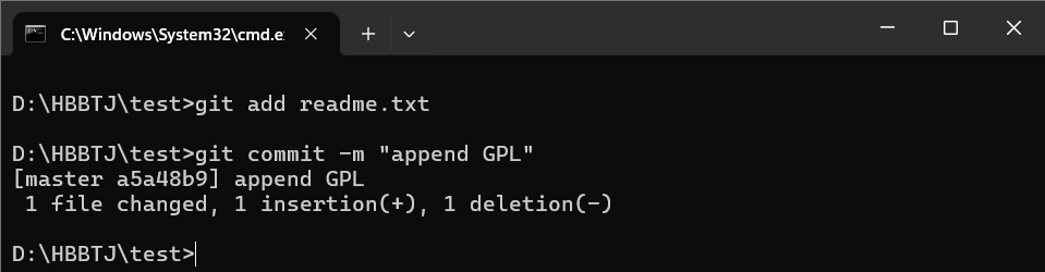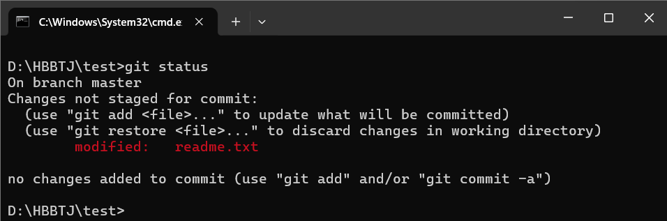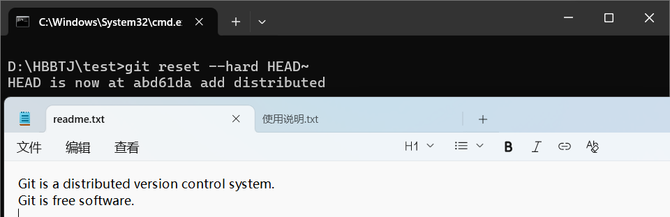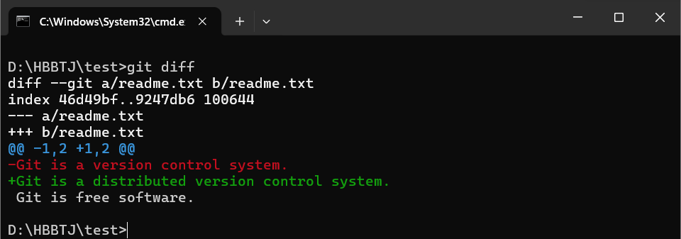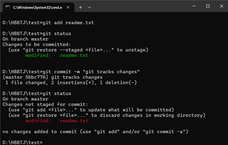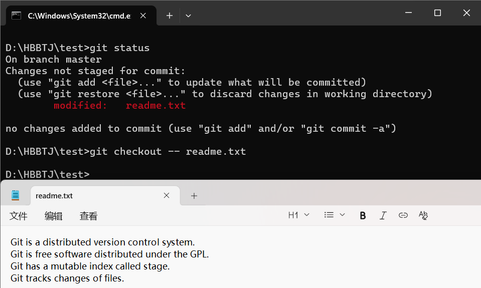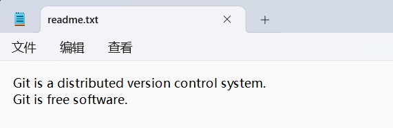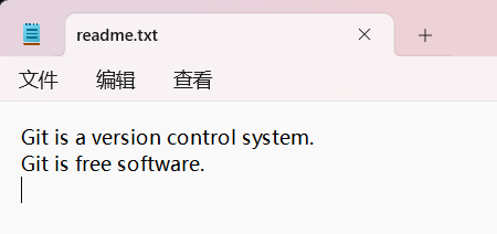 :1个文件被改动(我们新添加的readme.txt文件);2 insertions