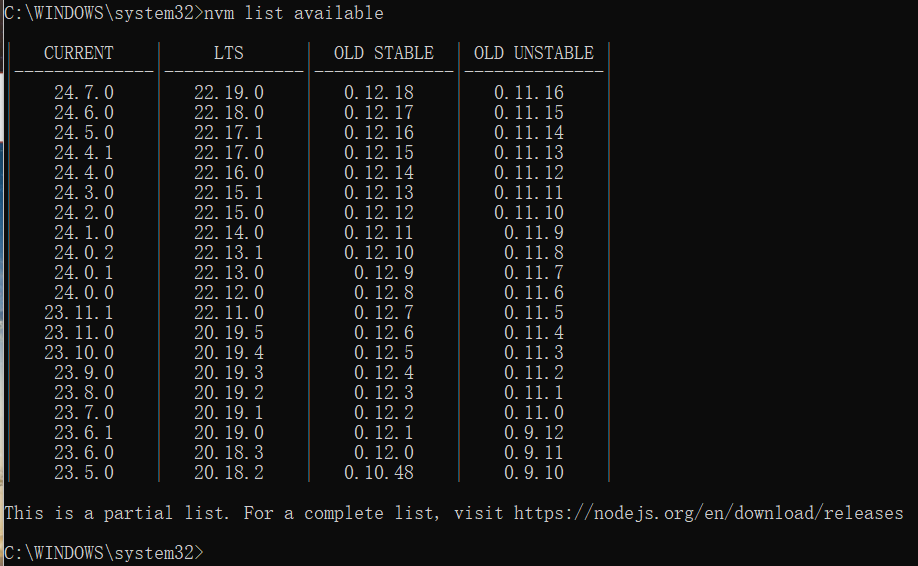 查看可安装版本 | nvm list available |